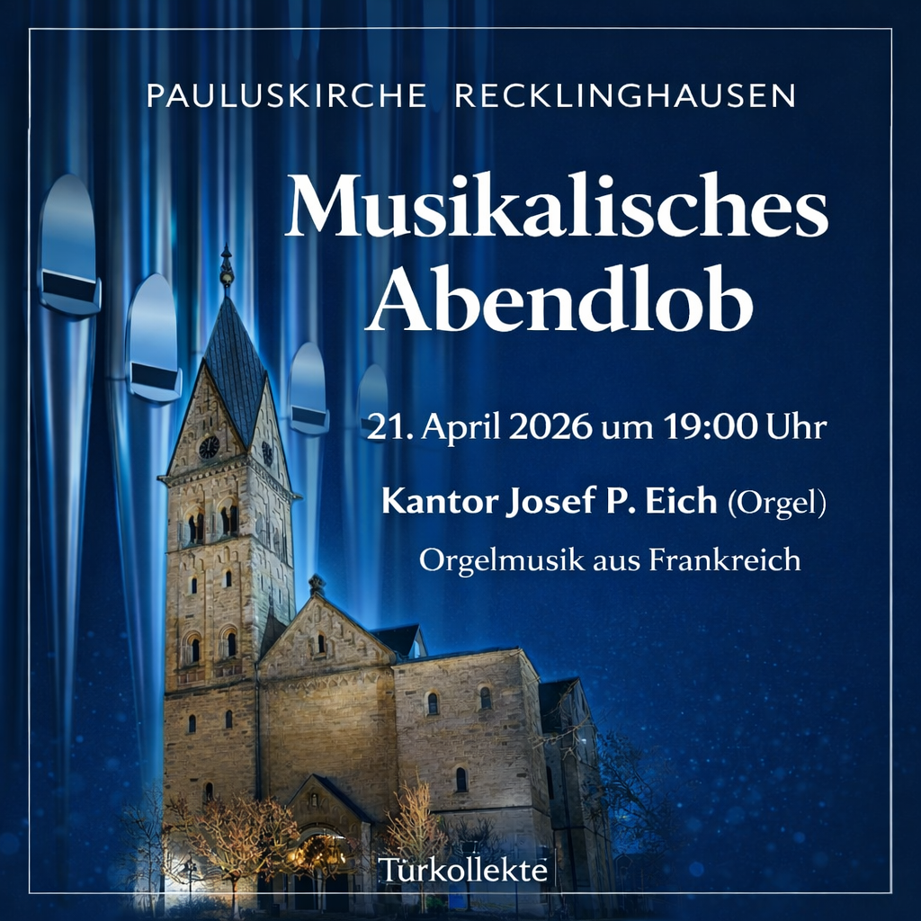 Musikalisches Abendlob in der Pauluskirche Recklinghausen Am Dienstag, 21. April 2026, findet um 19:00 Uhr in der Pauluskirche Recklinghausen ein musikalisches Abendlob statt. Unter dem Titel „Orgelmusik aus Frankreich“ gestaltet Kantor Josef P. Eich an der Orgel einen stimmungsvollen Abend mit ausgewählten Werken der französischen Orgelliteratur. Die besondere Atmosphäre der Pauluskirche bietet den idealen Rahmen […]