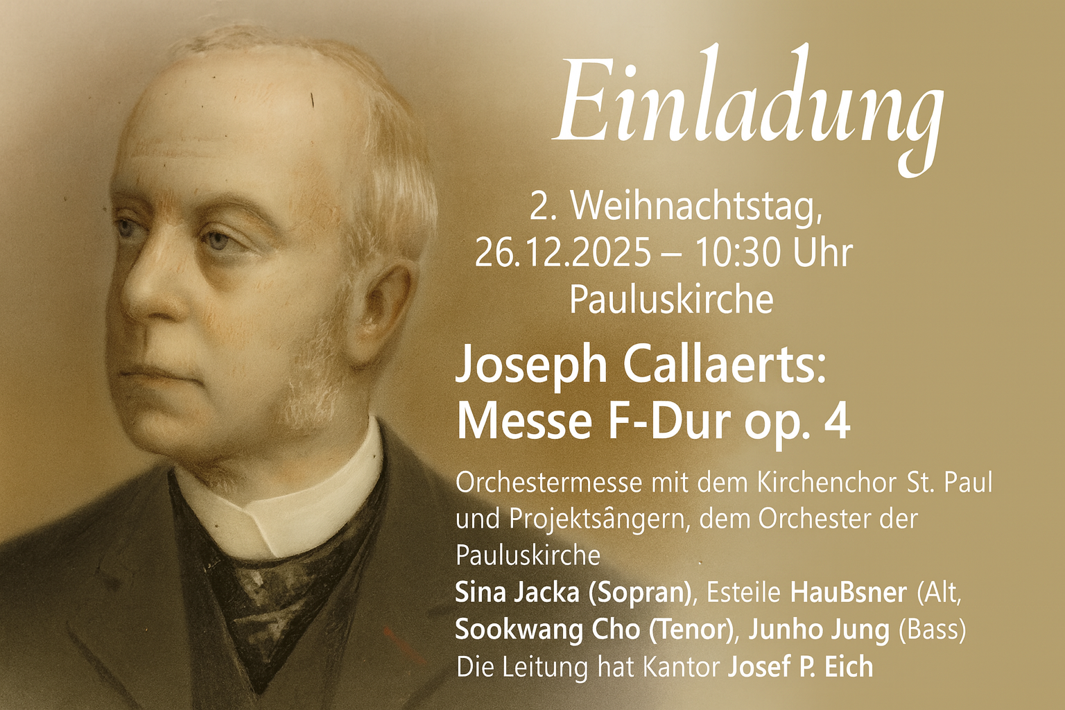Zweiter Weihnachtstag, 26.12.2025 um 10:30 Uhr in der Pauluskirche: Joseph Callaerts: Messe F-Dur op. 4 Orchestermesse mit dem Kirchenchor St. Paul und Projektsängern, dem Orchester der Pauluskirche, Sina Jacka (Sopran), Estelle Haußner (Alt), Sookwang Cho (Tenor), Junho Jung (Bass). Die Leitung hat Kantor Josef P. Eich. |