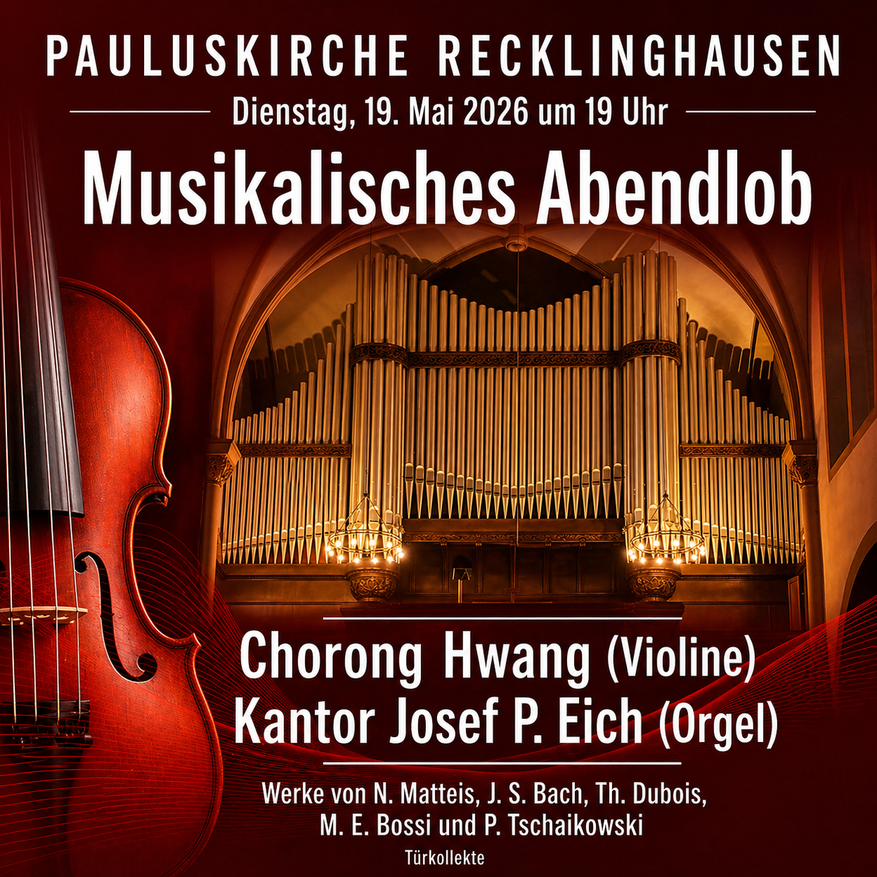 Musikalisches Abendlob in der Pauluskirche Recklinghausen Am Dienstag, den 19. Mai 2026, lädt die Propsteipfarrei um 19 Uhr zu einem besonderen musikalischen Abendlob in die Pauluskirche ein. Im stimmungsvollen Raum der Kirche erwartet die Besucherinnen und Besucher ein facettenreiches Programm für Violine und Orgel. Die Geigerin Chorong Hwang und Kantor Josef P. Eich an der […]