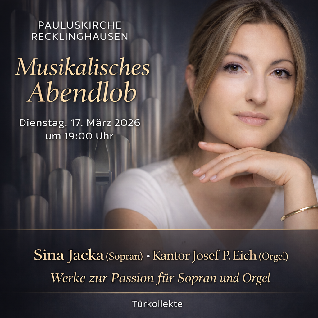 Musikalisches Abendlob in der Pauluskirche Am Dienstag, 17. März 2026, um 19:00 Uhr wird die Pauluskirche Recklinghausen zum Klangraum der Passion. Unter dem Titel „Musikalisches Abendlob“ entfaltet sich ein eindringlicher Dialog zwischen Sopran und Orgel. Sina Jacka (Sopran) und Kantor Josef P. Eich (Orgel) widmen sich Werken zur Passionszeit, die zwischen Innigkeit, Klage und hoffnungsvoller […]