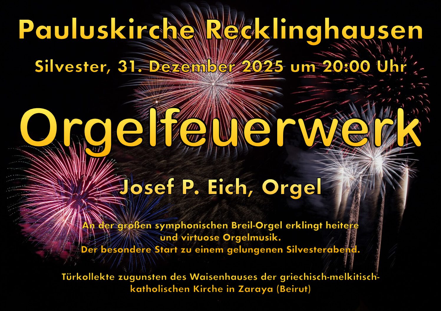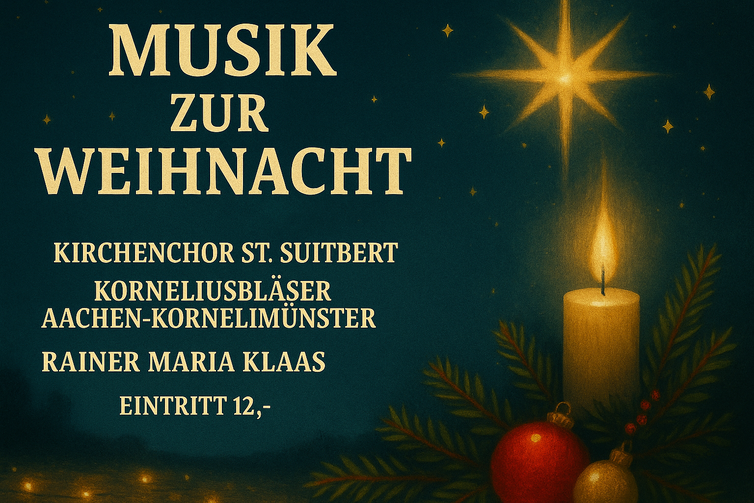 Pauluskirche An der Pauluskirche 15, Recklinghausen✨ Musikalisches Abendlob ✨Pauluskirche Recklinghausen📅 16. Dezember 2025⏰ 19:00 Uhr Ein besonderer Abend voller Klangfarben und Besinnlichkeit erwartet euch: 🎺 Jan Andres – Trompete📯 Muxin Yang – Horn🎹 Josef P. […]
